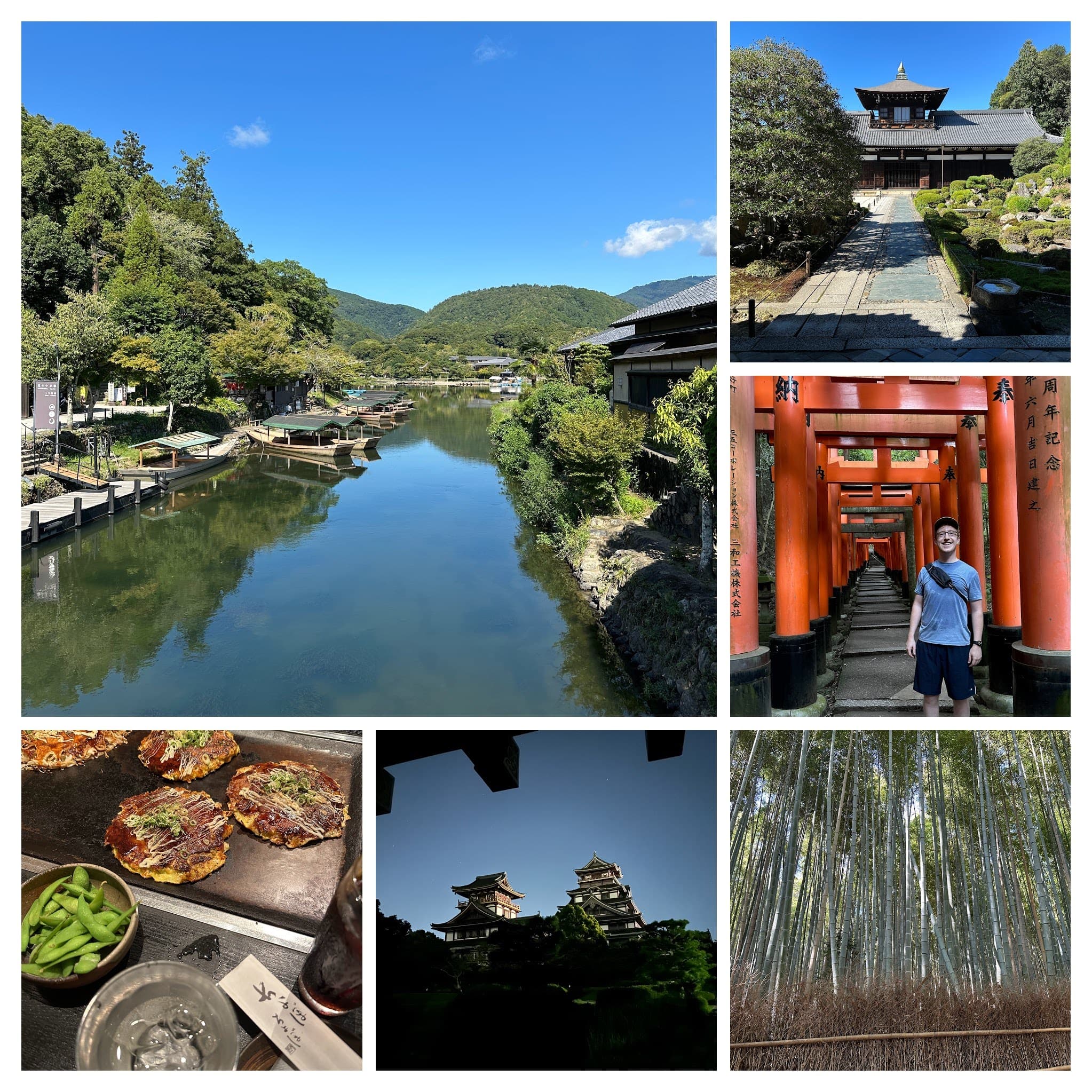 Main: Crossing a river in Kyoto on our way to the bamboo forest (pictured bottom right).